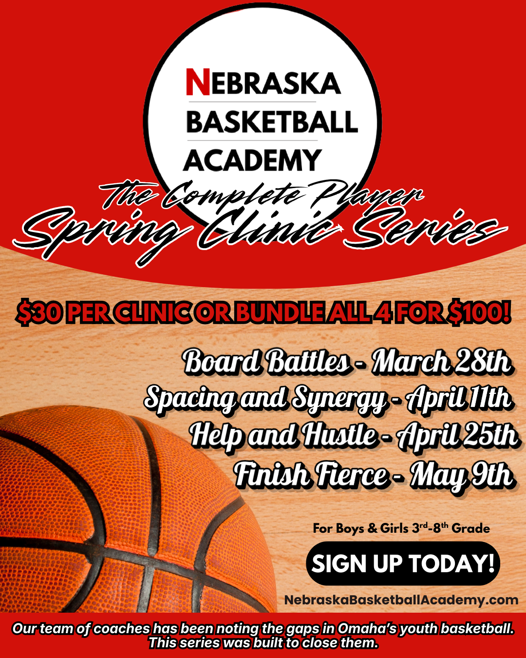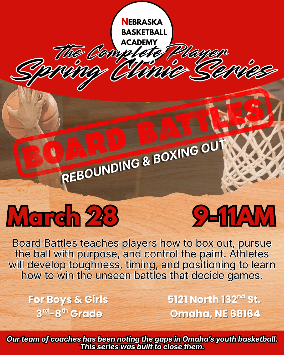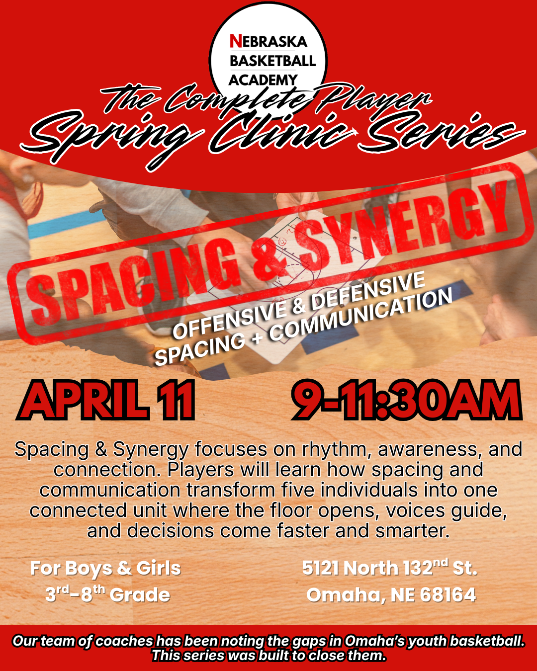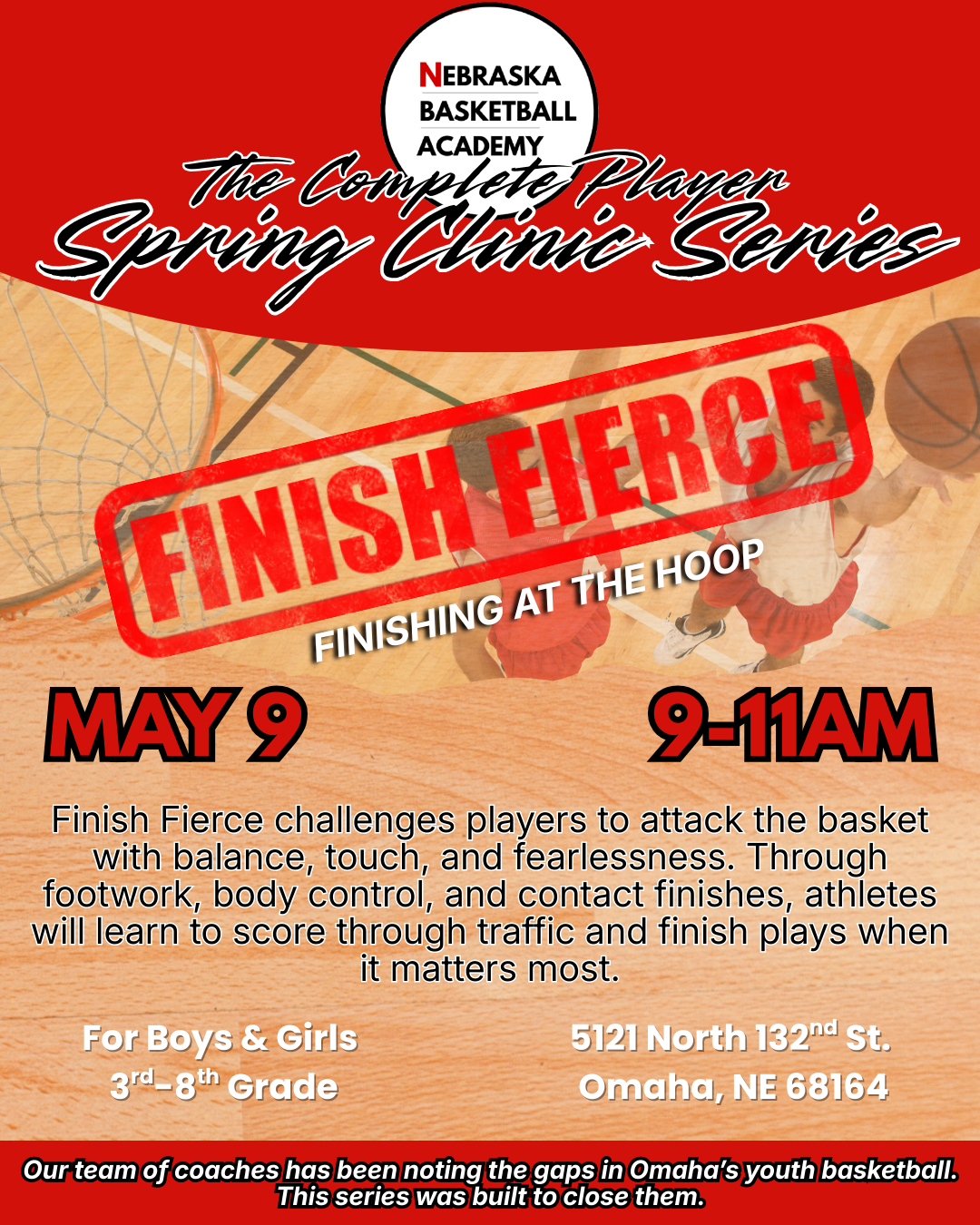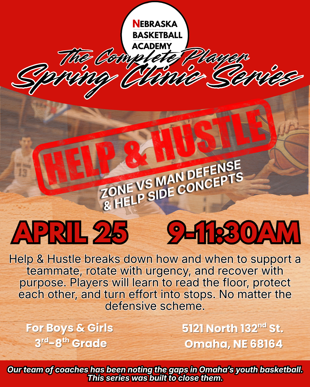 Led by coaches with years of experience developing youth and high school athletes across Omaha, The Complete Player - Spring Clinic Series is a four-part exploration of what the game truly demands. It’s not just skill and effort, but presence and awareness as well. Each clinic centers around a fundamental truth of basketball: how space is claimed, how trust is built, how contact is embraced, and how moments are finished. This is where players learn to play the game with intention, toughness, and rhythm. Our coaches will teach real game techniques, so players are able to compete with purpose, think the game more clearly, and play with an edge that shows up on both sides of the court.
